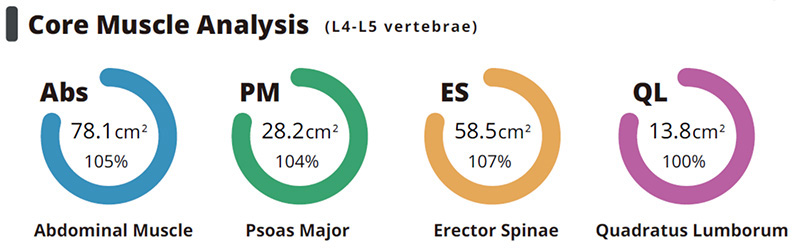 As such, modern preliminary assessment of Core Muscle Area has increasingly turned to body composition analysis to receive the area and size of key functional core muscles, including: