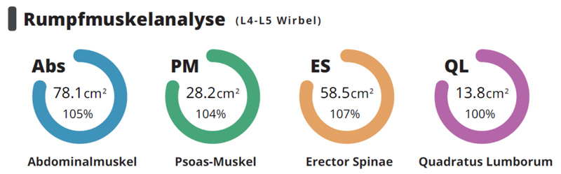 Daher greift die moderne vorläufige Bewertung der Rumpfmuskelfläche (Core Muscle Area) zunehmend auf die Körperanalyse zurück, um Fläche und Größe der wichtigsten funktionellen Rumpfmuskeln zu ermitteln, einschließlich: