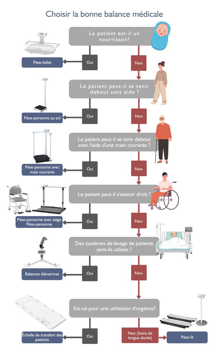 Considérez l'état clinique et le niveau de mobilité du patient. Des appareils spécialisés tels que les balances de lit, les balances fauteuils, les balances pour fauteuils roulants ou les lève-personnes peuvent réduire la charge de travail du personnel et augmenter la sécurité lorsqu'il s'agit de mesurer des patients à mobilité réduite.