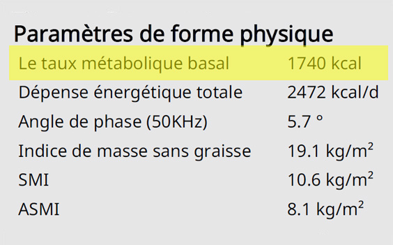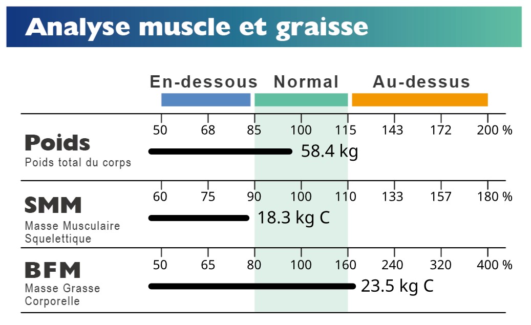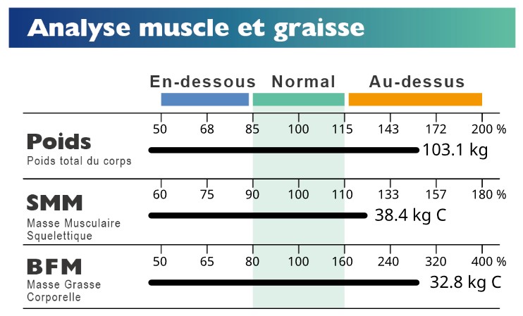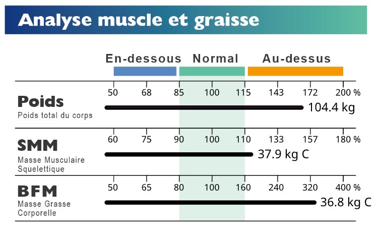 Le client a effectivement besoin de développer sa masse musculaire squelettique, mais en même temps, nous pouvons voir que sa masse grasse est élevée, malgré un poids normal.