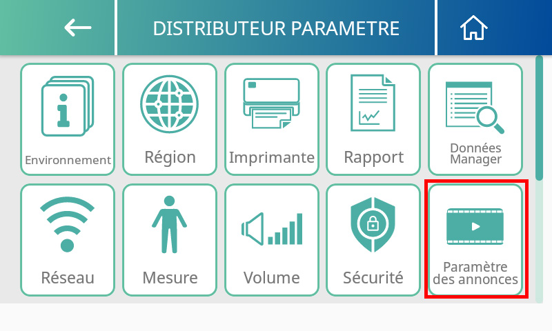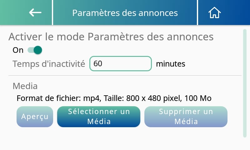 2. Activez le mode "Paramètres des publicités" et définissez le temps d'inactivité. (un temps d'inactivité de "5 minutes" signifie que la vidéo commencera à être lue après 5 minutes d'inactivité de l'appareil)
