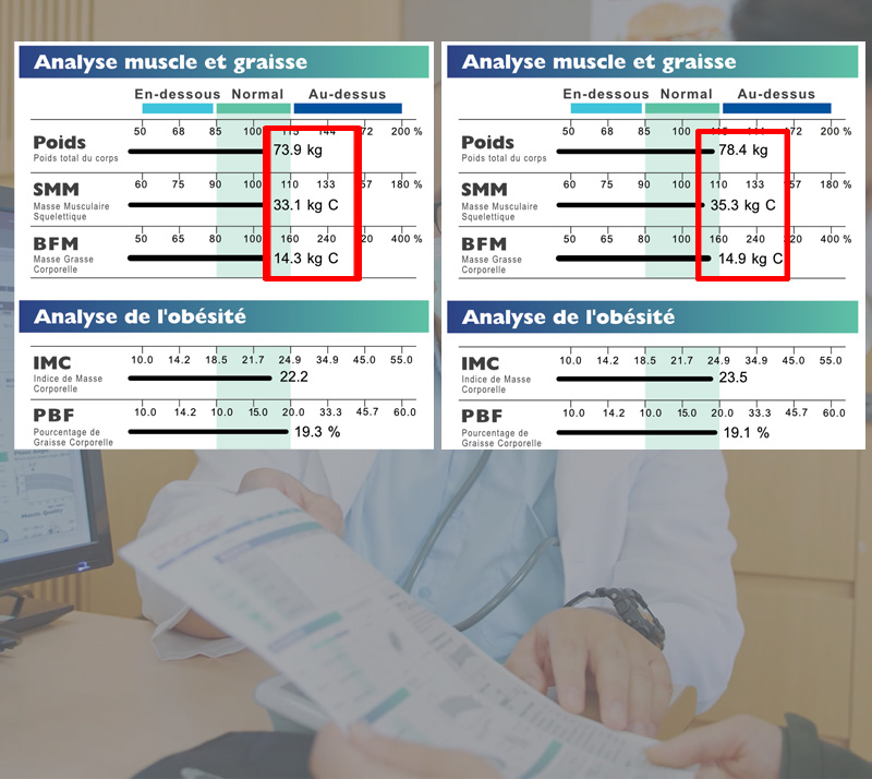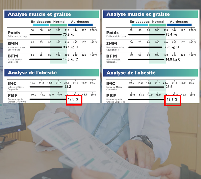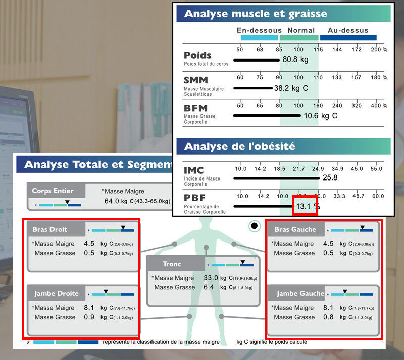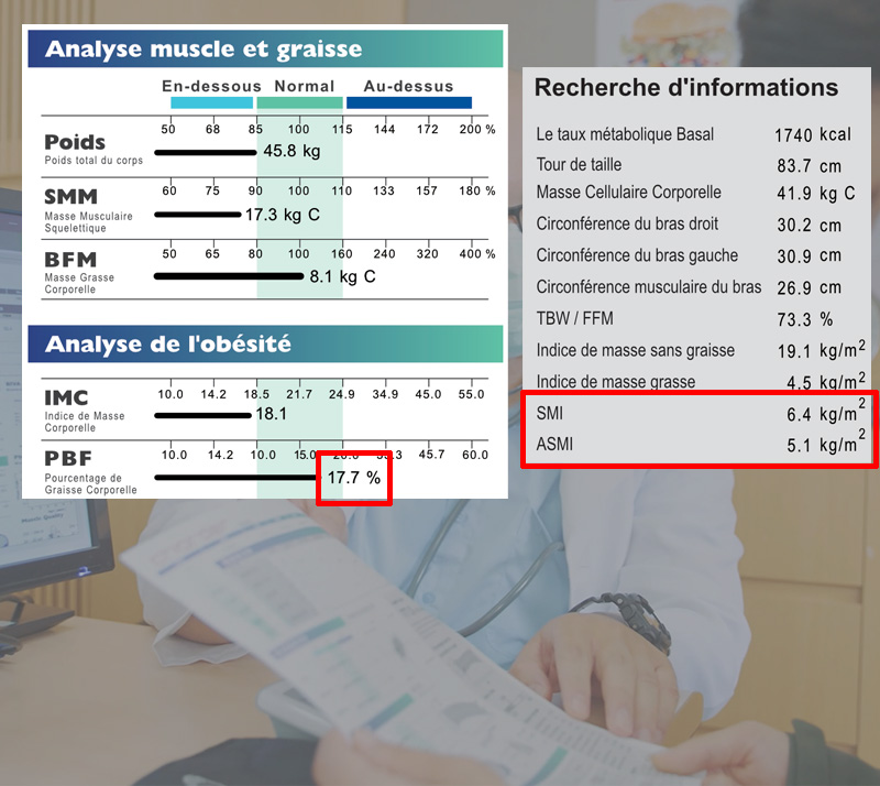 Si la graisse corporelle d'une personne est normale mais que son poids est faible, nous recommandons de vérifier l'SMI (Indice de Masse Musculaire Squelettique) / ASMI (Indice de Masse Musculaire Appendiculaire Squelettique) et de le comparer aux fourchettes limites pour la sarcopénie. S'il est inférieur à la limite, il est probable que son niveau musculaire est trop bas et doit être augmenté !
