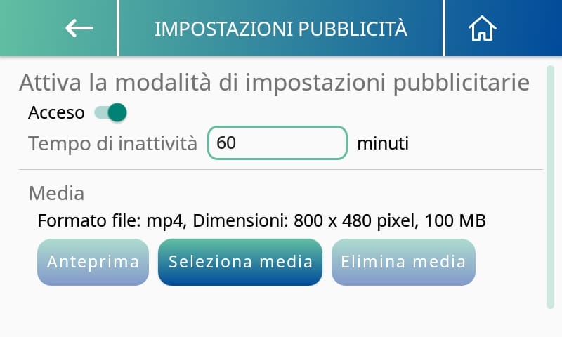 2. Attiva "Modalità Impostazioni Annunci" e imposta il Tempo di Inattività. (un tempo di inattività di "5 minuti" significa che il video inizierà a riprodursi dopo 5 minuti di inattività del dispositivo)