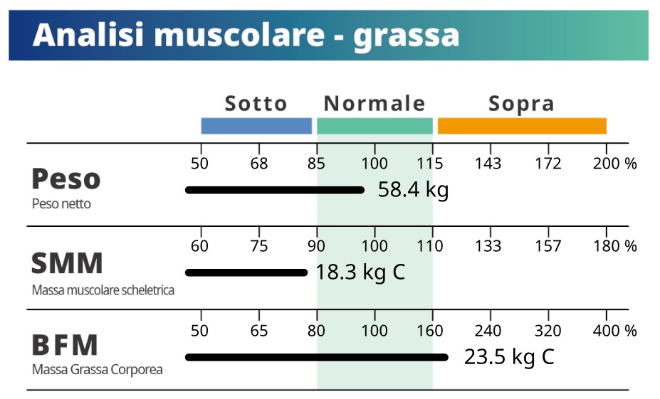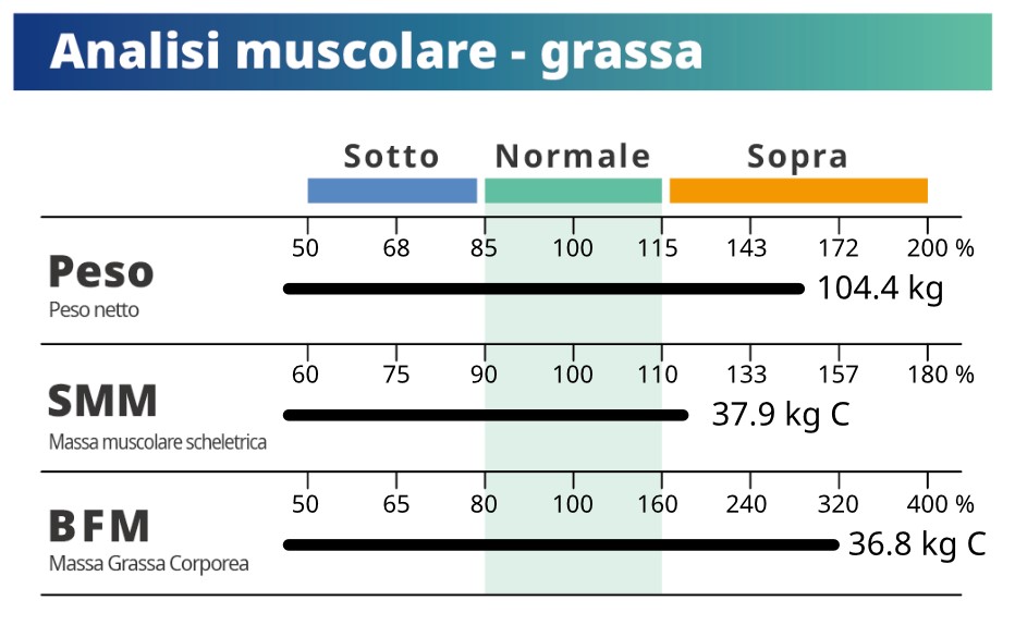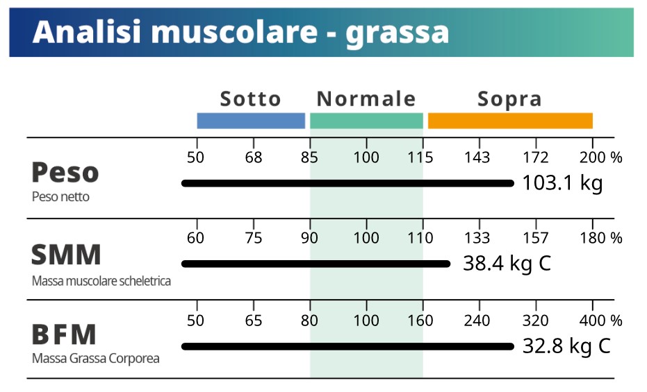 Il cliente ha effettivamente bisogno di sviluppare la massa muscolare scheletrica, ma allo stesso tempo, possiamo vedere che il suo grasso corporeo è elevato, nonostante un peso normale.