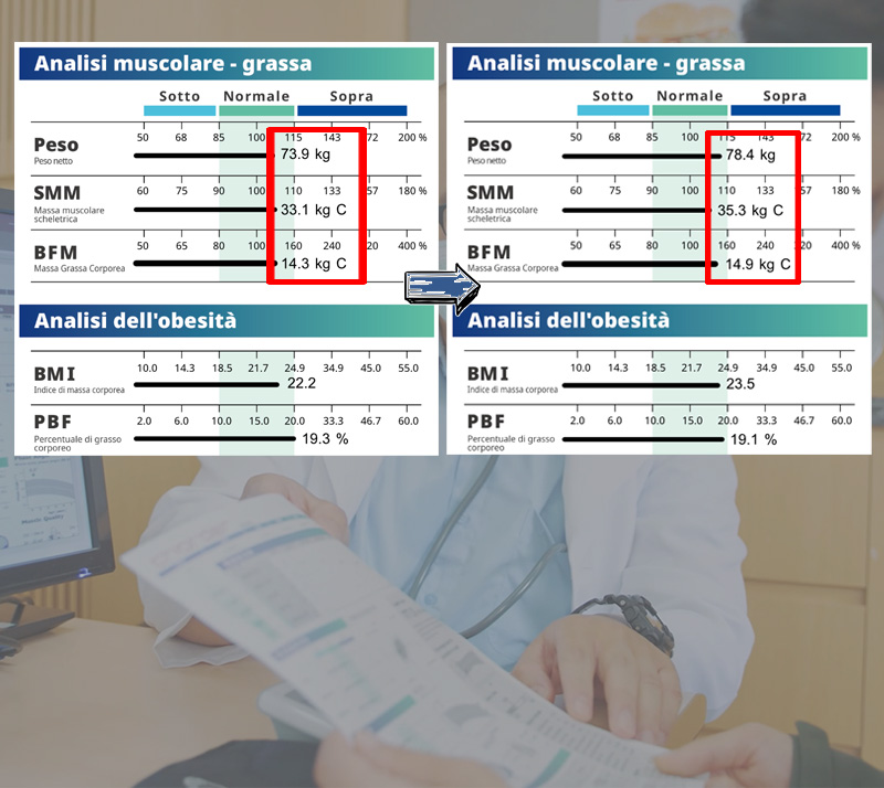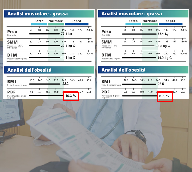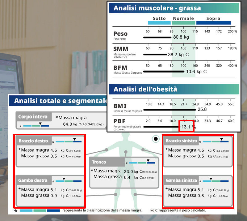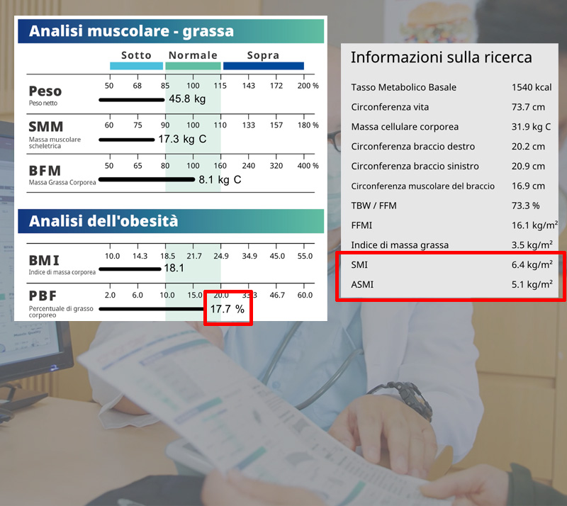 Se il grasso corporeo di una persona è normale ma il suo peso è basso, si consiglia di controllare l'SMI (Skeletal Muscle Index) / ASMI (Appendicular Skeletal Muscle Index) e confrontarlo con gli intervalli di cut-off per la sarcopenia. Se è inferiore al limite di cut-off, è probabile che il livello muscolare sia troppo basso e debba essere aumentato!