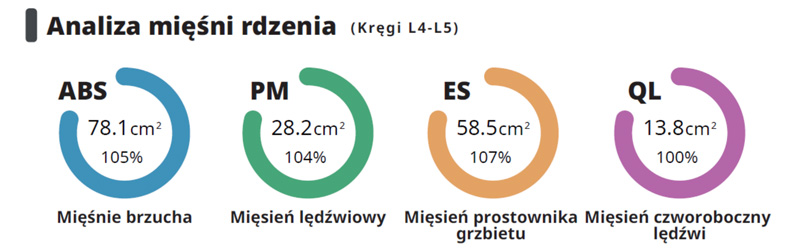 Wartości procentowe opierają się na „standardowej” sylwetce jako 100%, wskazując na stopień rozwoju mięśni. Ten znormalizowany wynik pozwala na ocenę równowagi między czterema grupami mięśni core, umożliwiając planowanie treningu ukierunkowanego na słabsze mięśnie.