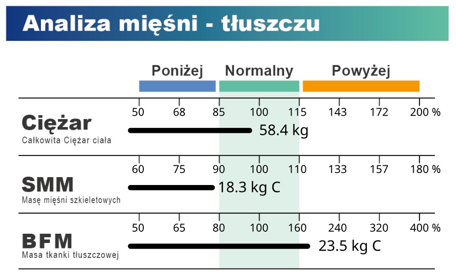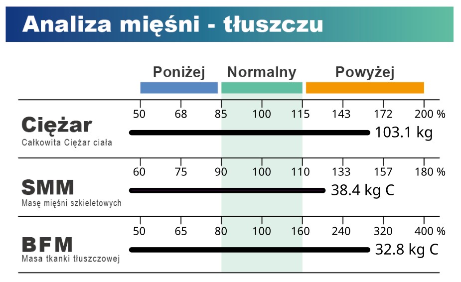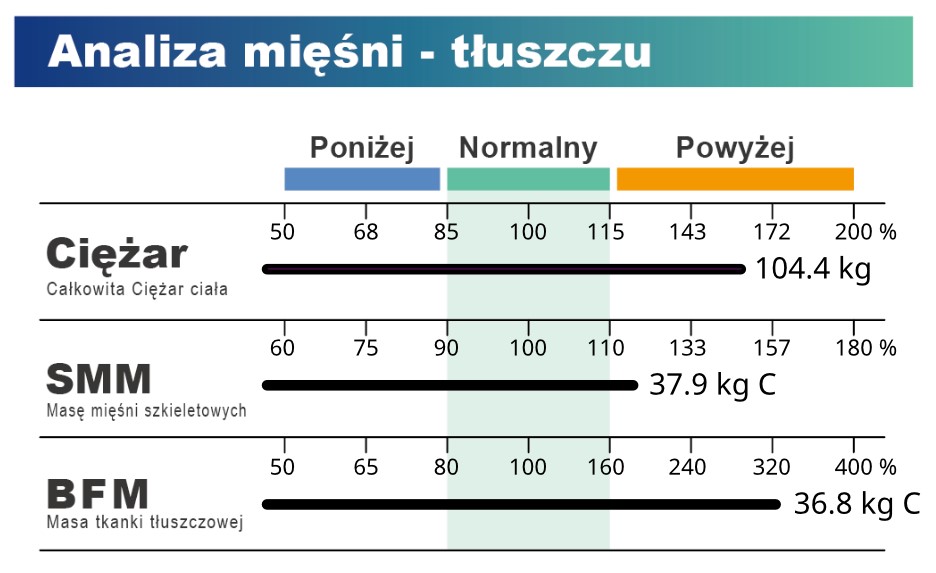 Klient rzeczywiście potrzebuje rozwinąć masę mięśni szkieletowych, ale jednocześnie widzimy, że jego tkanka tłuszczowa jest wysoka, pomimo normalnej wagi.