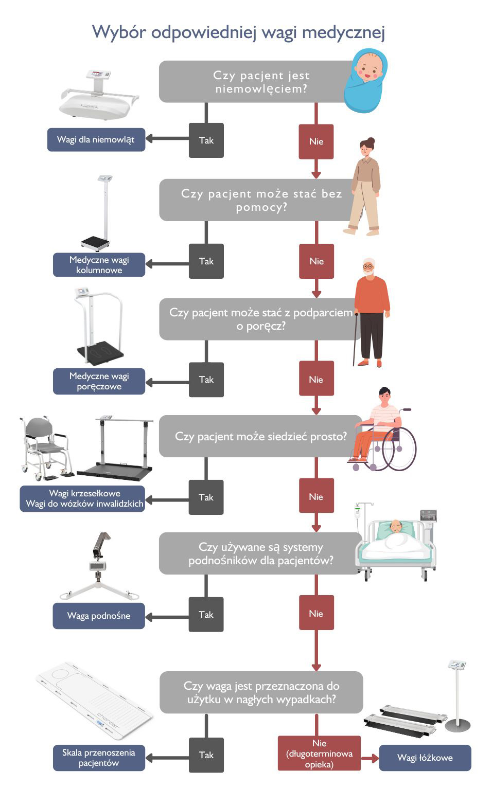 Rozważ stan kliniczny pacjenta i jego poziom mobilności. Specjalistyczne urządzenia, takie jak wagi łóżkowe, wagi krzesełkowe, wagi dla wózków inwalidzkich lub wagi podnośnikowe, mogą zmniejszyć obciążenie personelu i zwiększyć bezpieczeństwo podczas pomiaru pacjentów o ograniczonej mobilności.