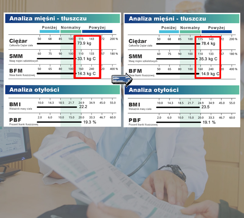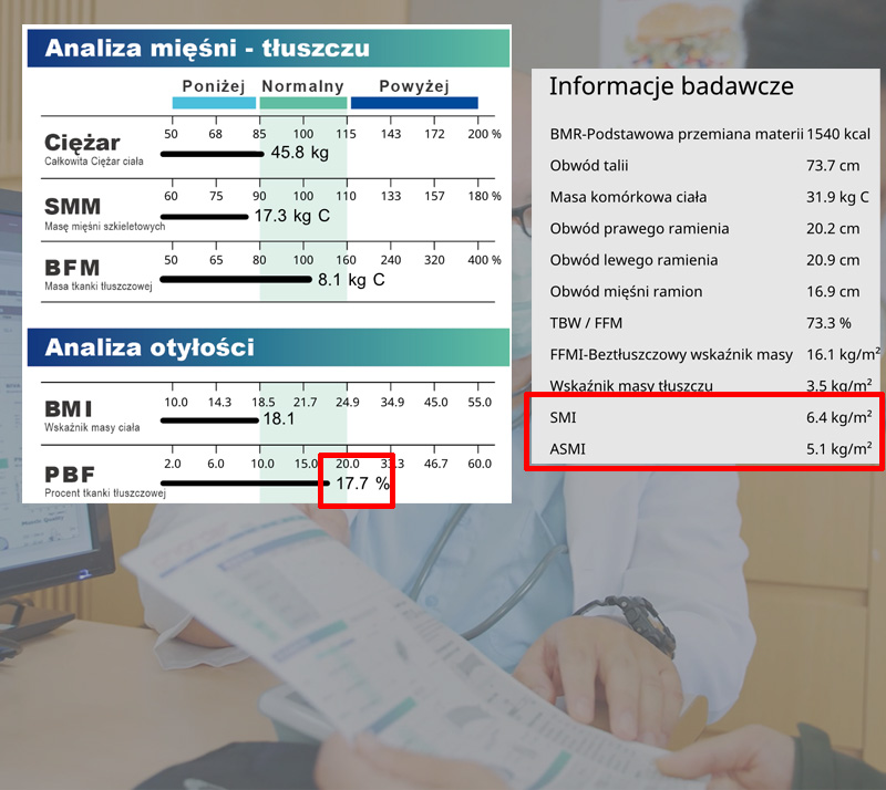 Jeśli tkanka tłuszczowa danej osoby jest w normie, ale jej waga jest niska, zalecamy sprawdzenie SMI (Skeletal Muscle Index) / ASMI (Appendicular Skeletal Muscle Index) i porównanie go z zakresami odcięcia dla sarkopenii. Jeśli jest niższy niż limit odcięcia, prawdopodobnie poziom mięśni jest zbyt niski i należy go zwiększyć!