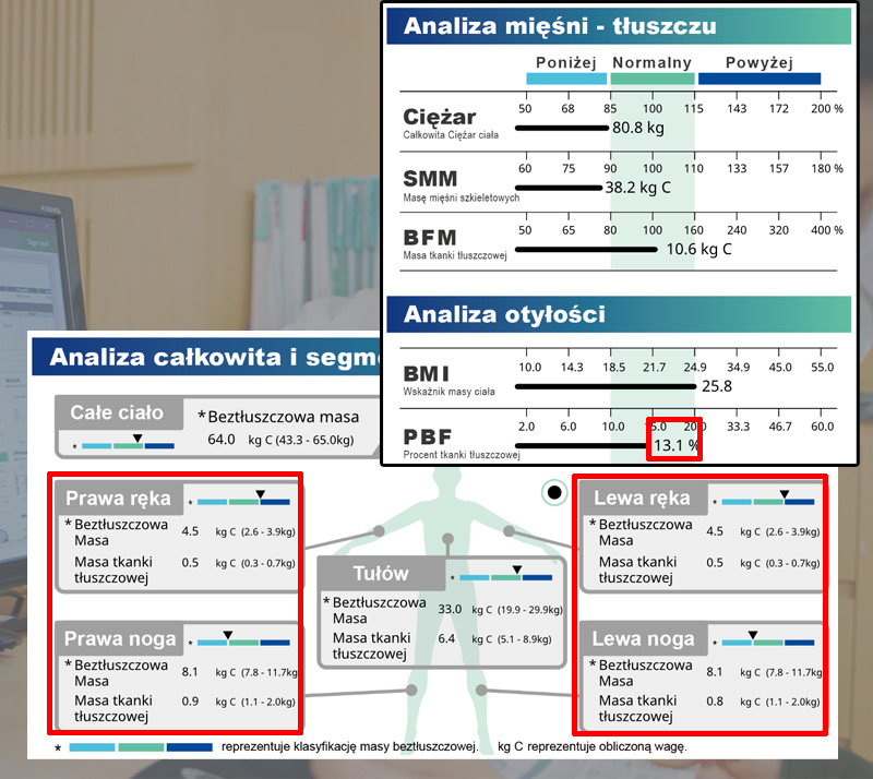 W powyższym przykładzie widzimy, że ogólny bilans mięśniowo-tłuszczowy tej osoby jest całkiem dobry, z wyższą niż normalnie masą mięśni szkieletowych i zdrowym PBF. Jednak, gdy spojrzymy na wyniki segmentowe, ich górna część ciała jest znacznie bardziej rozwinięta w porównaniu do dolnej części ciała.