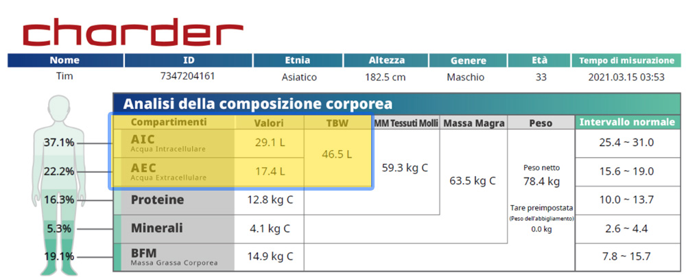 Acqua Intracellulare (AIC): L'acqua contenuta all'interno delle cellule del corpo. Questa è acqua sana e funzionale.