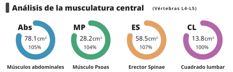 Por ello, la evaluación preliminar moderna del Área Muscular del Núcleo ha recurrido cada vez más al análisis de la composición corporal para obtener el área y el tamaño de los músculos funcionales clave del núcleo, incluyendo: